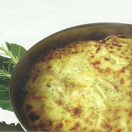 Yağsız bir tavaya soğanları koyun ve kıymayı ilave edin. Orta ateşte 15 dakika kadar veya kıyma suyunu çekene kadar pişirin. Harcınız kızardıktan sonra maydanoz ve tuzu ekleyip karıştırın. Ocaktan alın. Bir büyük tencerede suyu kaynatın ve içerisine tavuk veya sebze bulyon, tuz ve makarnayı ekleyerek 15 dakika kadar arada bir karıştırarak pişirin. Ateşten alın ve suyunu süzün. Fırını 200 °C ısıtın. Bir başka tencereye süt, yumurta, un, nane, hellim veya peyniri koyun ve karıştırın. Orta ateşte devamlı karıştırarak pişirin. Yoğun krema kıvamına gelince ateşi kapatın. Geniş ve derin bir fırın tepsisinin (32cm) içine haşlanmış makarnanın yarısını koyun ve hazırladığınız beyaz sosun ⅓ ‘ü ile karıştırın. Üzerine kıymalı harcı ilave edin. Daha sonra tekrar makarnayı koyun ve son olarak üzerine kalan kremayı dökün. 200 °C de ısıtılmış fırında 30 dakika veya üstü kızarıncaya kadar açık bir şekilde pişirin. Sıcak servis yapın.